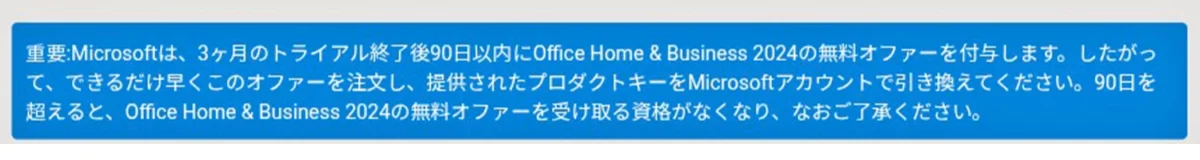自業自得だからどうしようもありませんが、この『要求』が表示されてからプリインストール版のOffice Home & Business2024に切り替えが可能な期間には、期限があるようです。